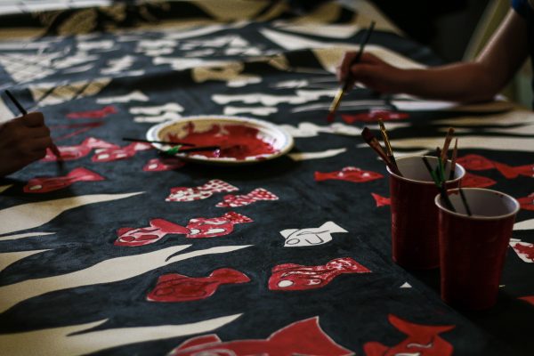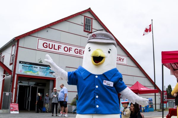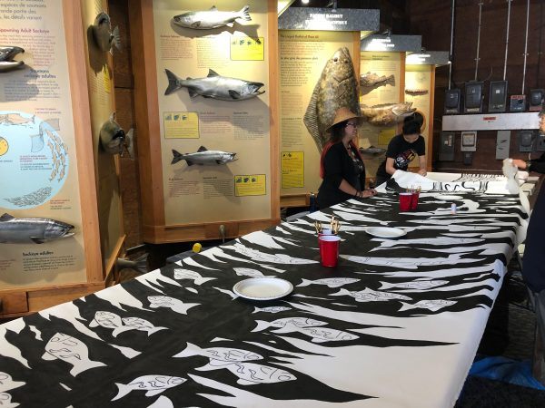 Throughout the event, many stopped by to paint a community mural facilitated by First Nations artist Christine MacKenzie. It depicted the life cycle of the salmon, from egg to spawning salmon, all in the shape of a large tree. Visitors used red paint to add their artistic touches in the painting of the mural, and the finished product consisted of unique styles that showed off the collaborative nature of this project. At the end of the day, the mural was carried by the performers outside the Cannery where the closing ceremony was held with more dancing and singing.