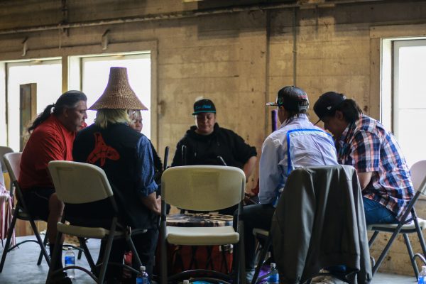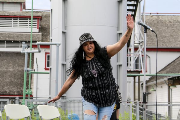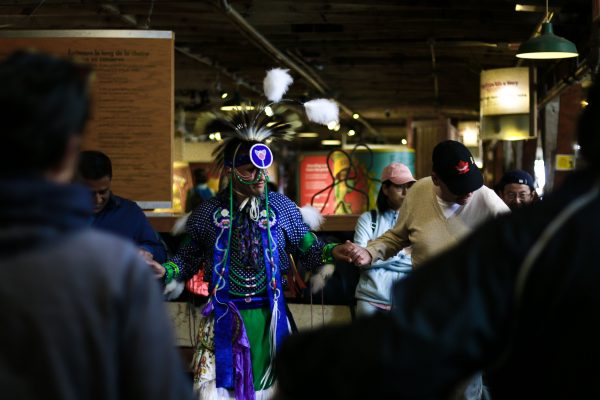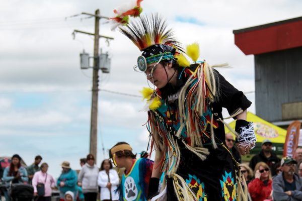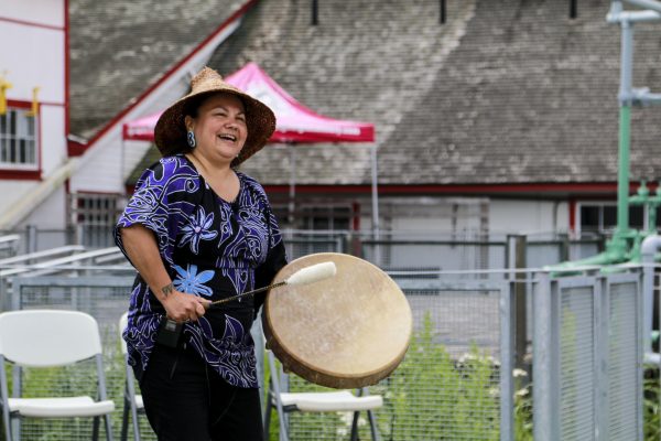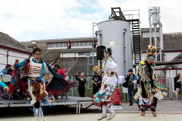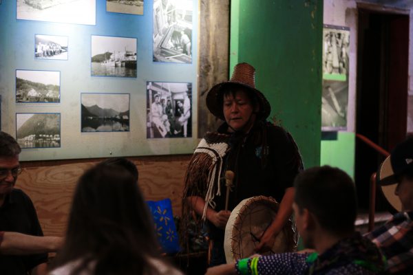 The celebration opened with a collaborative performance between the Starchild Drumming Group and the Eagle Connection Dancers. With high energy and loud voices, the drumming group attracted dozens of people to listen and follow them into the Cannery. The Eagle Connection Dancers moved swiftly with their feet, the tiny silver horns or small wooden paddles on their robes jangling in harmony, and invited audience members to dance along with them. Meanwhile, Indigenous storytelling and games were held inside the historic cannery, entertaining children and adults alike.