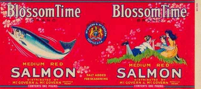 Mimi’s pick: ” I like this BlossomTime Brand label because it depicts my favourite time of year (Spring) and the cherry blossoms that I love so much. I’m not sure what (which species) a “Medium Red Salmon” is, and the label is from Seattle Washington, but when I look at this label it reminds me of springtime in Steveston.”