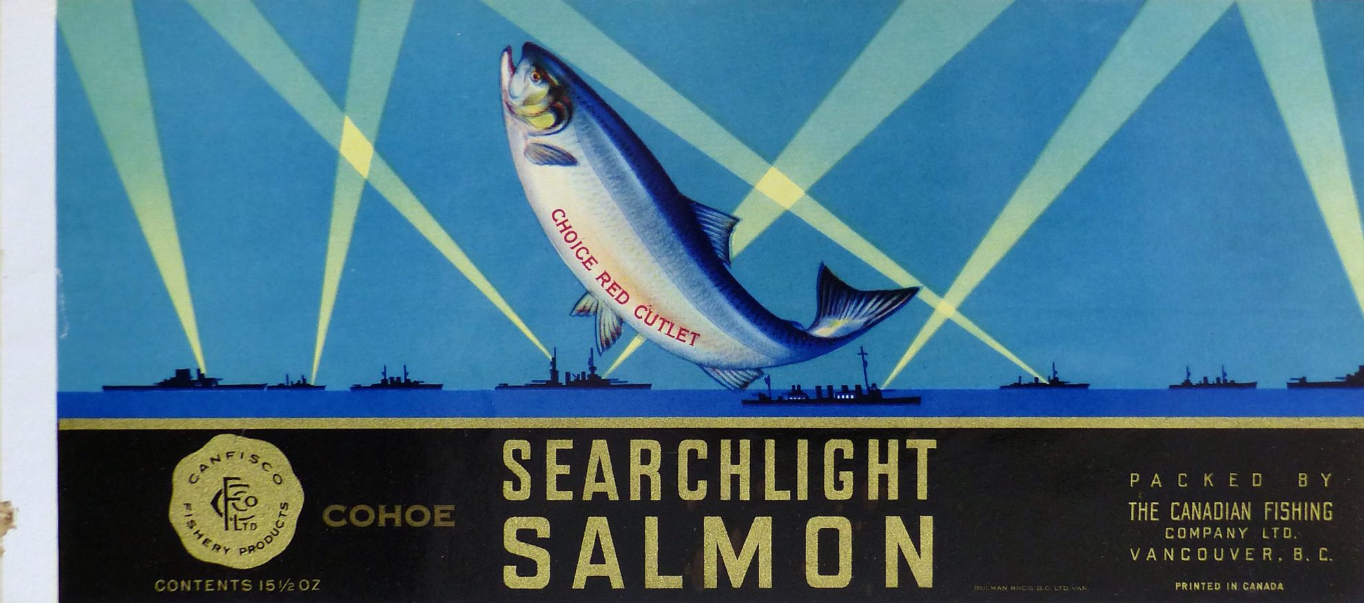 Rob likes this Searchlight Salmon label’s distinctive colour (blue), plus the image of the giant salmon being illuminated by searchlights above the battleships is uniquely bizarre. (G2015.009.202)